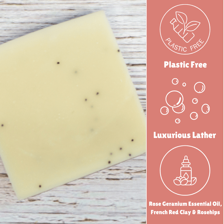 Our Rose Geranium Cold Process Soap with ground rosehips combines the fragrant essential oil of rose geranium with the exfoliating benefits of finely ground rosehips. The floral aroma of rose geranium invigorates the senses, while the ground rosehips gently exfoliate, removing dead skin cells to promote smoother, softer skin.